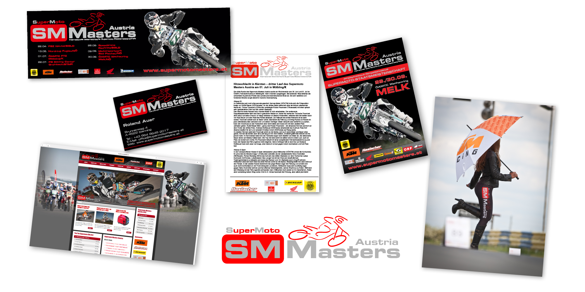 Entwicklung eines Corporate Designs für die österreichische Supermoto Staastmeisterschaft 2012. Logo, Farbkonzept, Schriftarten, Bildsprache. Inklusive Produktion von 5x6m Planen für den Zielbereich, Skinsuits für die Promo-Girls, Plakaten, Parkplatz-Schildern, Startertafeln, Crew-Shirts,...